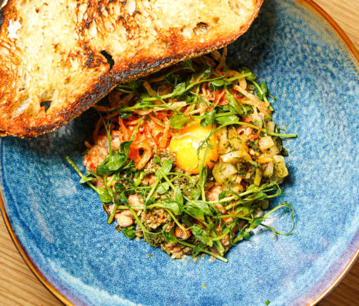 tomato, provolone, fried egg, lemon aioli and pistou, is