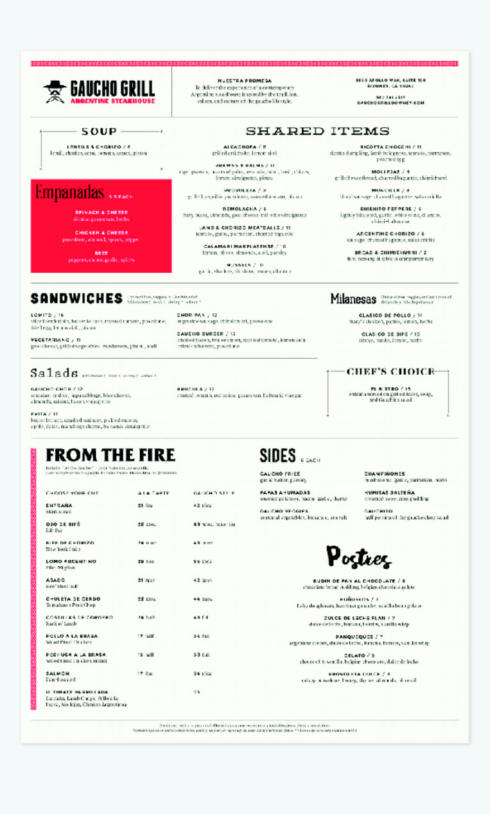 Gaucho Grill is a celebration of contemporary Argentine cuisine and the tradition, values and culture of the Gaucho lifestyle.We take pride in providing our guests with an authentic experience in a warm and inviting atmosphere, perfect for social and business lunches, entertaining dinners and fun celebrations. All of our steaks are cooked over an open fire, popularly known in Argentina as “the gaucho way." In addition to offering the most popular Argentine cuisines, we have a selection of wines found throughout the country. Discover the taste of Argentina for yourself!